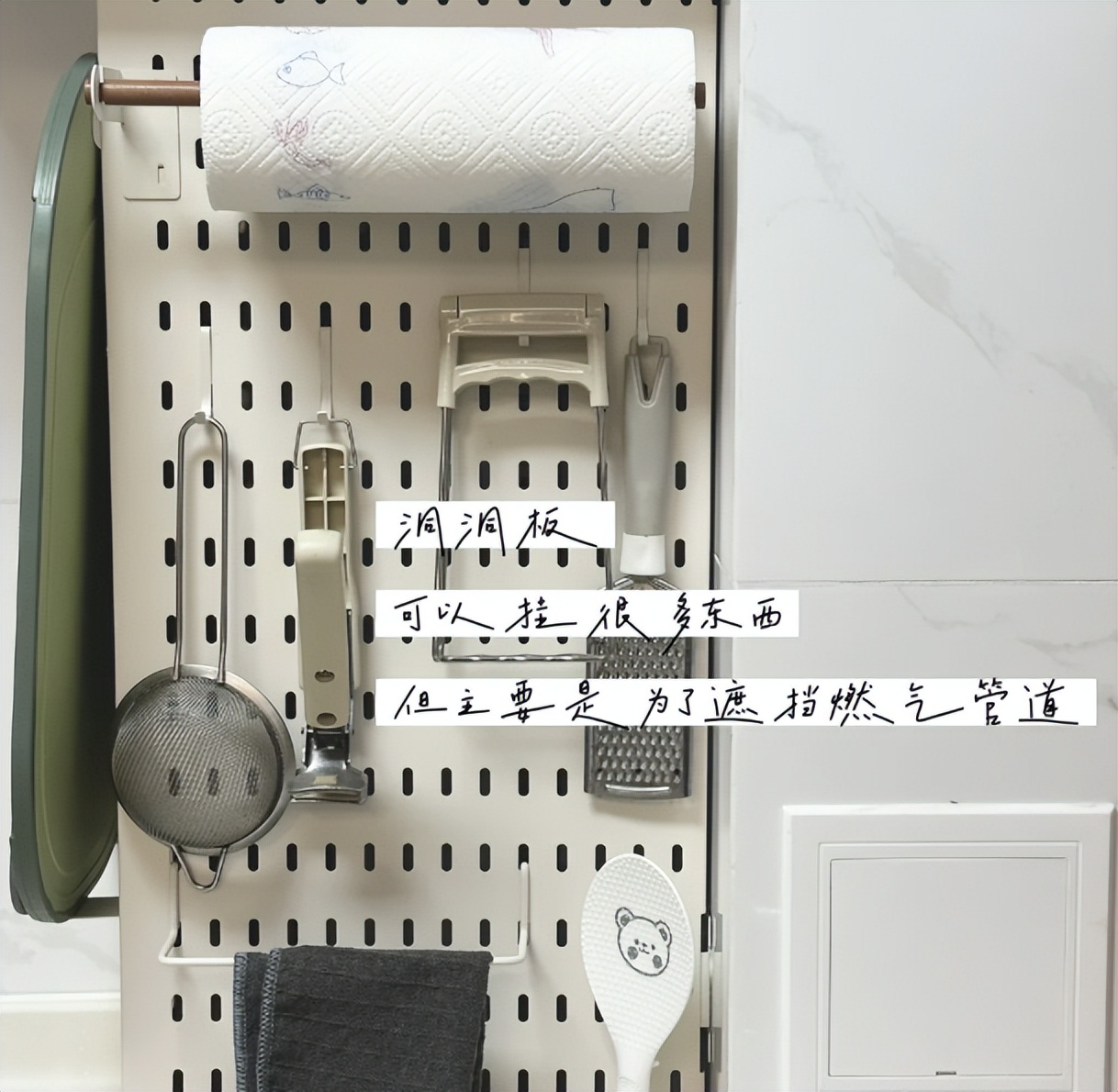 洞洞板既可以遮丑,把燃气管隐藏起来,外面还可以收纳厨房用品。