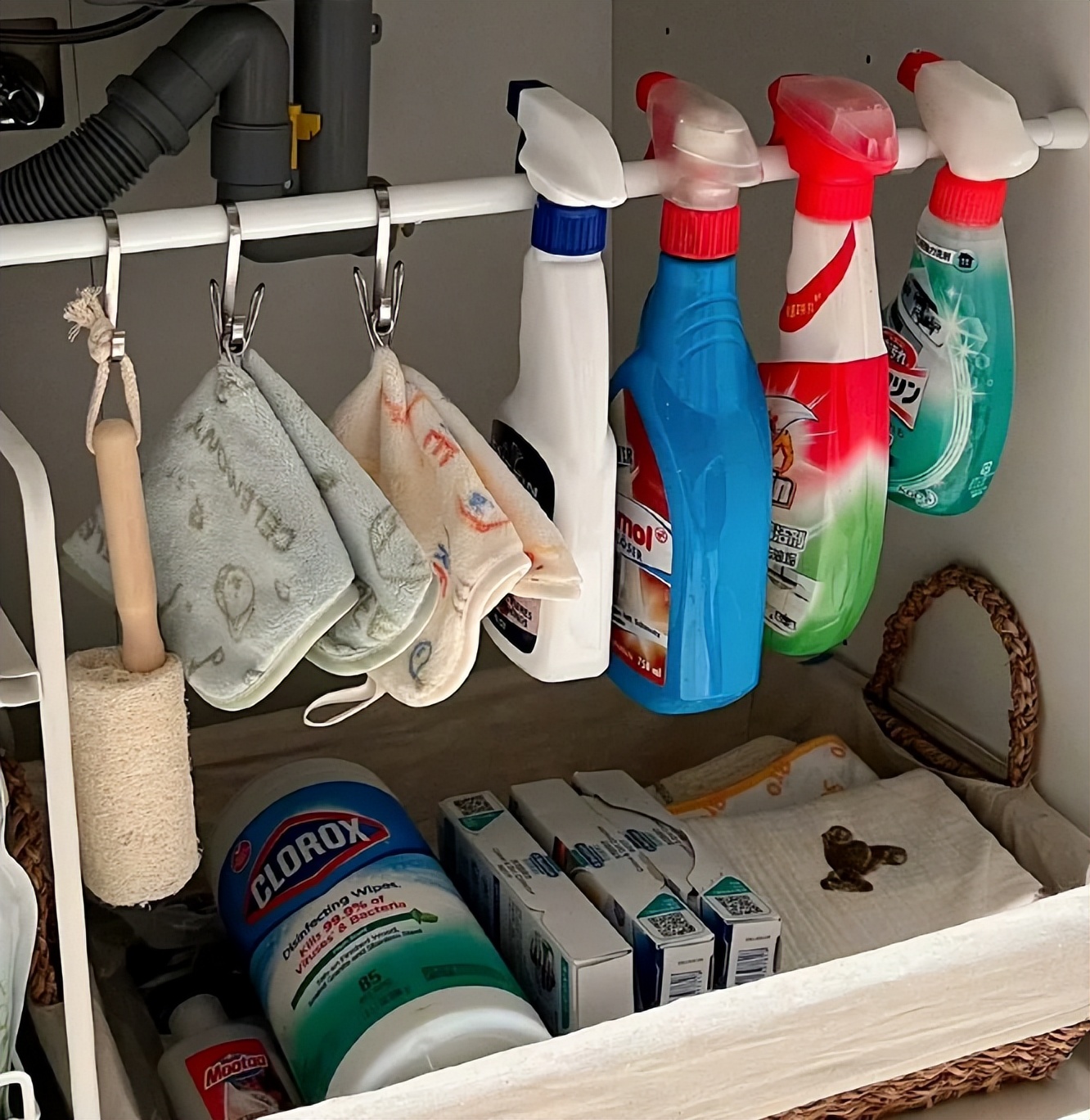可以用来收纳抹布,而且一些清洁剂,可以直接挂在伸缩杆上。