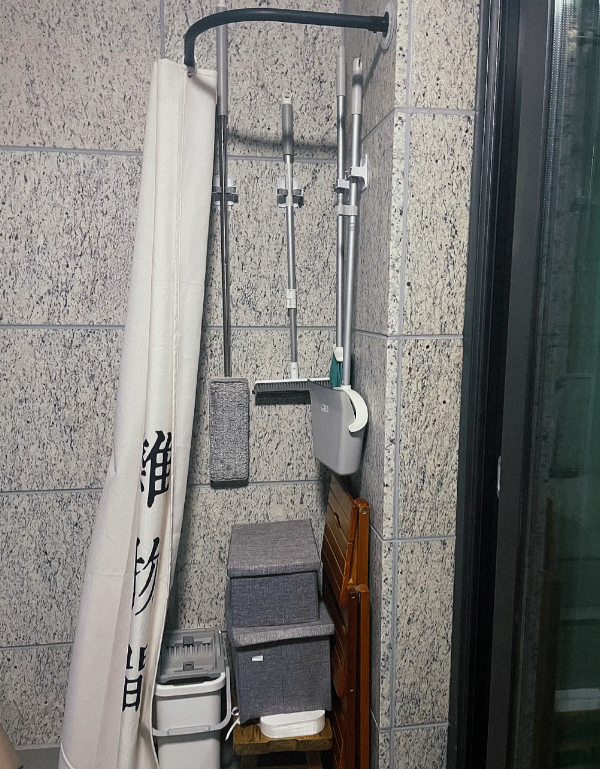 把弧顶杆子固定在高处,再把帘子挂在弧形杆子上面,里面放上清洁工具、或者杂物。