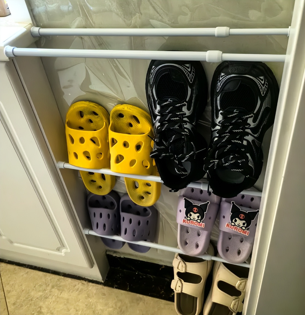 鞋柜里面设计不合理,直接在里面固定几根伸缩杆,鞋柜空间一分为二,瞬间就变成了两层,用来收纳鞋子刚刚好。