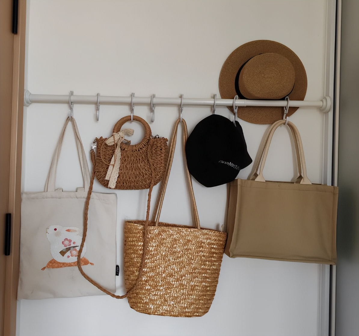 固定好了之后,这些挂钩就可以用来收纳,平时穿的衣服、戴的帽子、包包之类的。