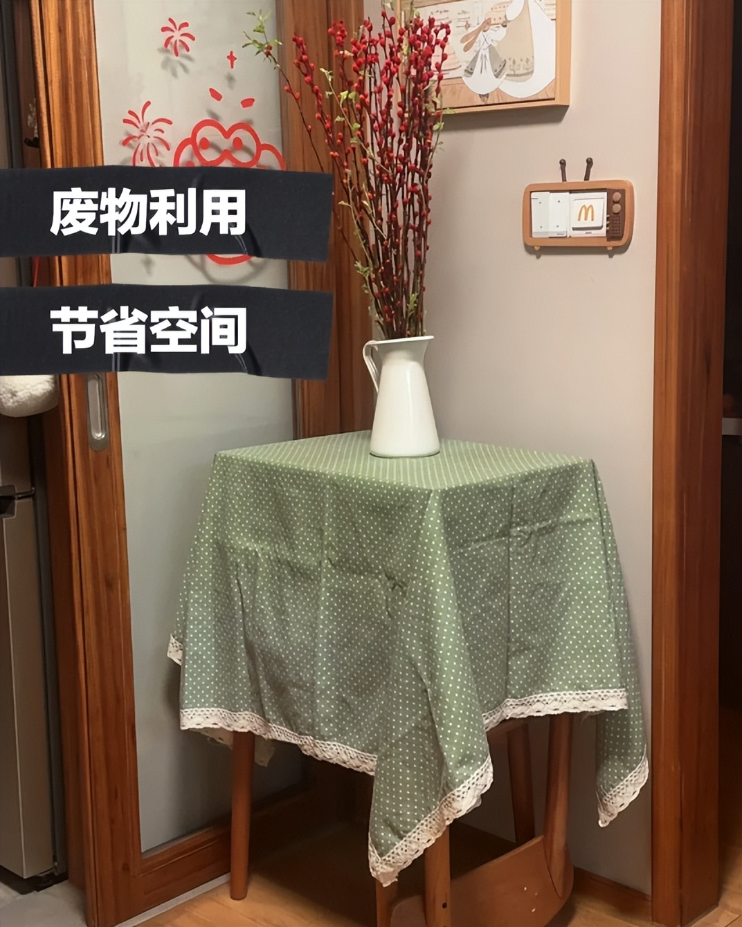 再在上面铺上一层好看的桌布,盖上桌布后,这不就是一个小桌子吗!