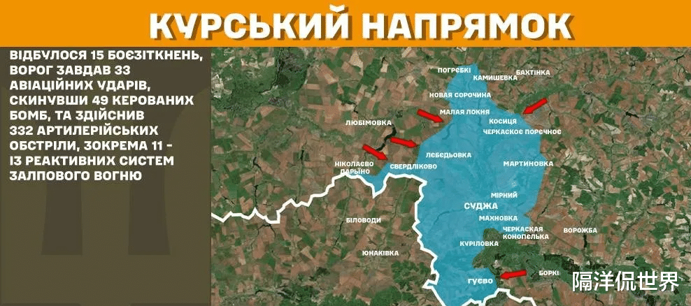在库尔斯克地区,发生了15次战斗冲突。俄军还搞了33次空袭,投下了49枚制导炸弹,搞了332次火炮袭击,其中11次是从多管火箭系统发射的。