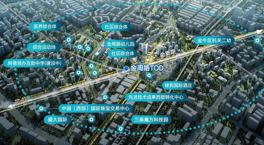 在教育资源方面,金周路TOD周边学府氛围浓厚。教育资源密布,提供了全龄段的教育服务。周边拥有四川省首批重点学校茶店子小学的三大校区,以及金牛区机关二幼、机关三幼等示范性幼儿园。在建的互助中学项目——将由成都树德中学领办,并命名为“成都市树德金泉中学校(本部)”。此举将全面提升该片区的教育资源配置水平,预计于2026年建成。