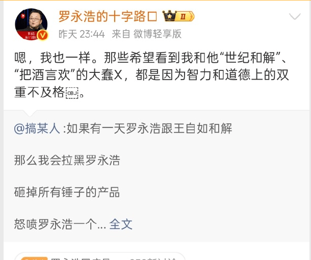 但凡事过犹不及,一次两次的调侃能博人会心一笑,可当罗永浩的段子里反复出现俞敏洪和王自如的名字,翻来覆去都是那些陈年旧事时,最初的新鲜感早已褪去,取而代之的是一种难以言喻的无聊感。听众会渐渐发现,这些调侃背后少了新意,多了几分执念,甚至让人觉得罗永浩有些 “睚眦必报”。事实上,俞敏洪从未真正与他为敌,两人只是职场路径不同的同行者,那些过往的分歧本就是行业常态;而王自如,即便当年的辩论闹得沸沸扬扬,本质上也只是观点碰撞的对手,而非需要长久记挂的敌人。