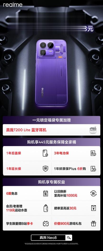 作为开年越级大作,真我Neo8集三星定制旗舰屏、第五代骁龙8、透明RGB设计与沉浸式电竞游戏体验,持续刷新同档标准。真我Neo8的新品预约已火热开启,即刻1元预约锁定加赠真我Buds T200 Lite蓝牙耳机、服务保障全家桶等至高2713元福袋,更多惊喜敬请期待。
