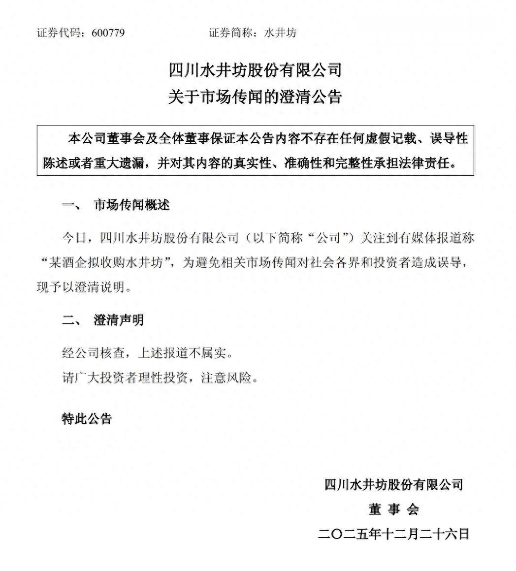 25日晚间,水井坊发布公告,澄清上述市场传闻。
