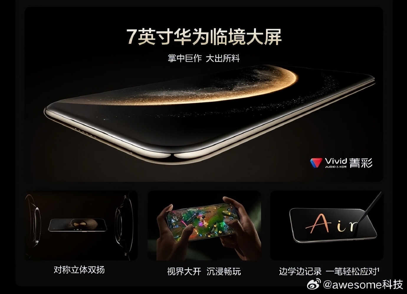 华为Mate70Air这款“Mate史上最薄的直板手机”的旗舰,首次将7英寸超大临境屏幕塞进仅6.6mm厚、208g重的纤薄机身中。它采用独特的18.8:9黄金比例,不仅视野开阔,还让单手握持更舒适。