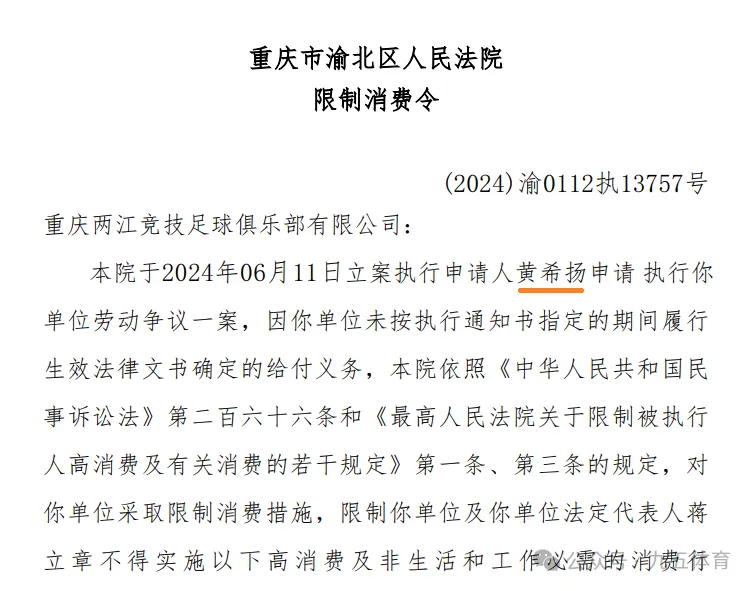 11月20日,重庆渝北区法院对重庆两江竞技足球俱乐部发布了“限制消费令”,因该俱乐部未按执行通知书指定的期间履行生效法律文书确定的给付义务,法院依照相关法律法规,对重庆两江竞技足球俱乐部采取限制消费措施,限制俱乐部及俱乐部法定代表人蒋立章“不得实施高消费及非生活和工作必需的消费行为。”