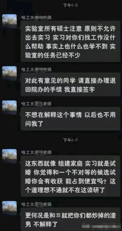 譬如有网友就发了一张截图,无论从语气还是内容,都能发现这位老师对学生出去实习充满了鄙夷。但是问题学生不能给你打工一辈子,他们最终还是要就业,而好点的单位都会看实习经历的。