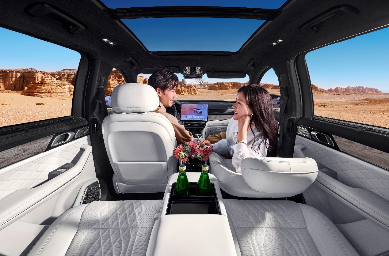 座舱内部的变化不仅限于色彩。2026款领克09四驱探索版采用了2+3的五座布局,二排座椅横向宽度达到1366毫米,确保了后排乘客的乘坐宽松度。副驾配备了电动腿托,并与第二排座椅协同,可组合成沙发床模式,提升了长途出行时的休憩便利性。第二排座椅还提供了通风、加热和按摩功能,结合多功能中央扶手,旨在提升后排乘客的舒适体验。这些配置的叠加,让车辆的使用场景从单纯的代步扩展至更丰富的家庭出行与商务接待。