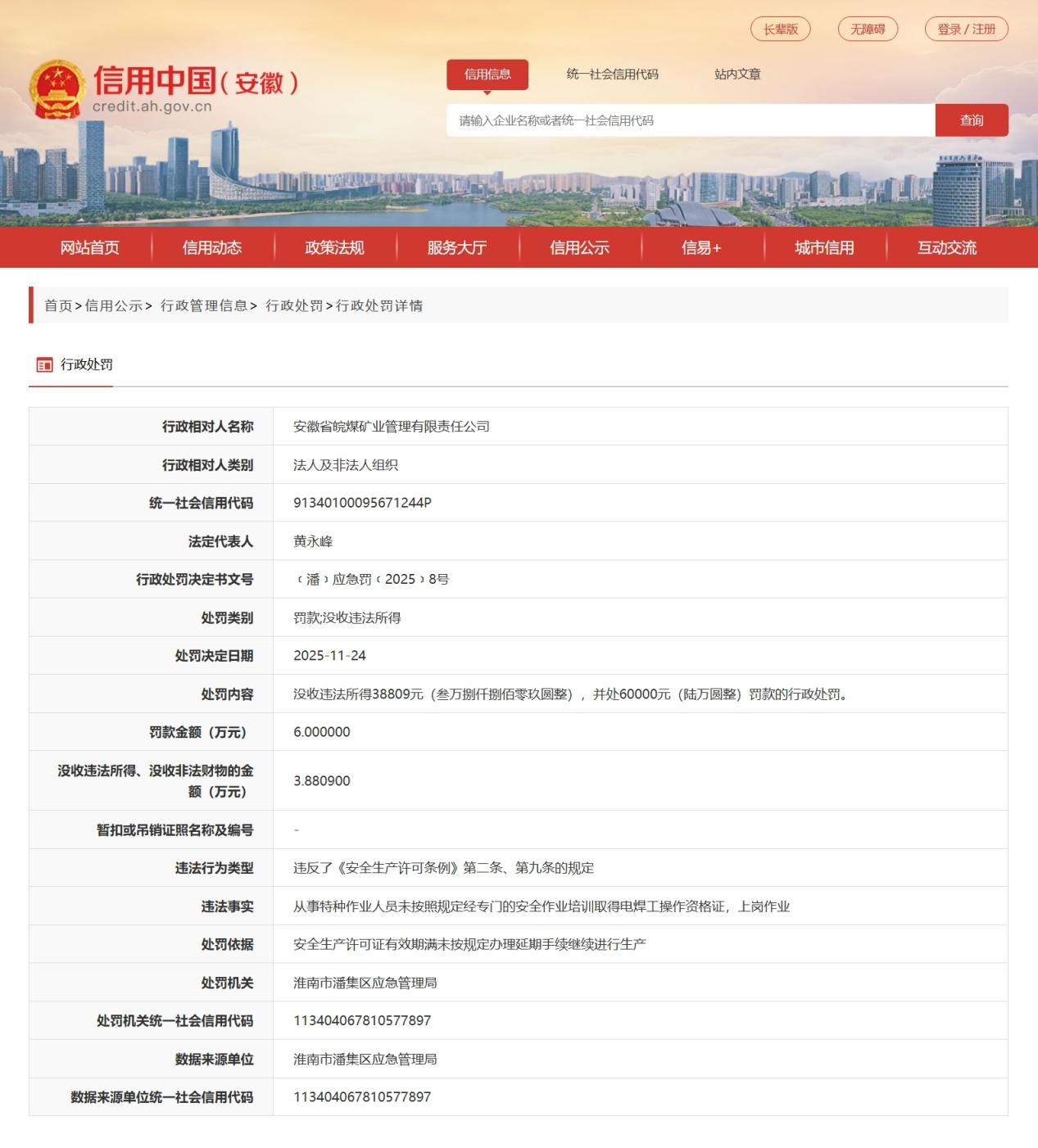 公开信息显示,安徽省皖煤矿业管理有限责任公司的违法行为类型是违反了《安全生产许可条例》第二条、第九条的规定,违法事实是从事特种作业人员未按照规定经专门的安全作业培训取得电焊工操作资格证,上岗作业。依据安全生产许可证有效期满未按规定办理延期手续继续进行生产,淮南市潘集区应急管理局决定:没收违法所得38809元(叁万捌仟捌佰零玖圆整),并处60000元(陆万圆整)罚款的行政处罚。