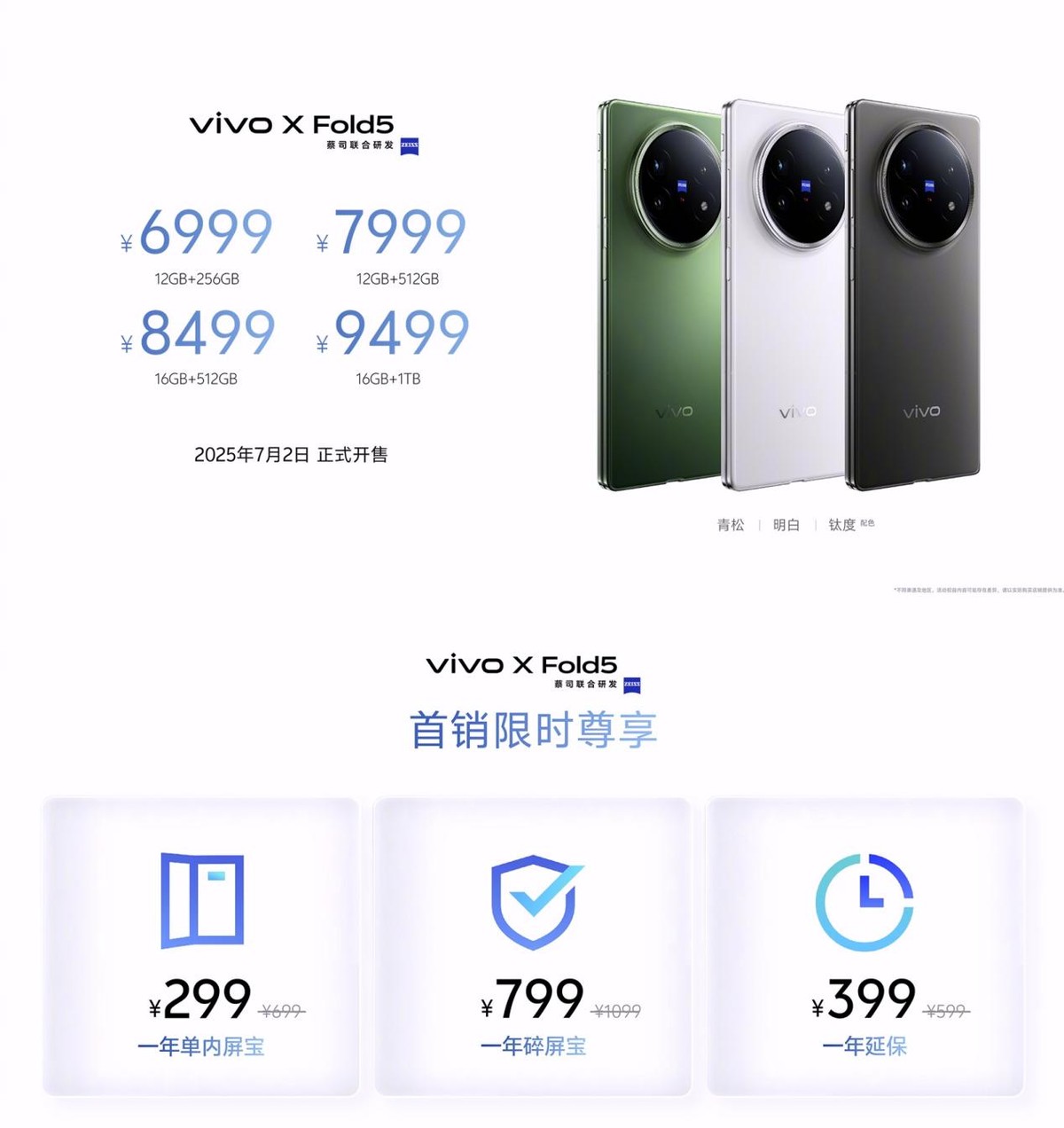 vivo X Fold5这次从重量、品质、续航到影像全面升级,每一处都彰显着极致的科技魅力,这样的折叠屏新王者,售价6999元起,预售通道已经打开,7月2日正式开售!心动就行动吧。