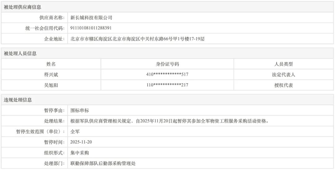2025 年 11 月 20 日,XX采购网发布《关于对新长城科技有限公司、万达信息股份有限公司、北京商海文天科技发展有限公司暂停处理公告》。