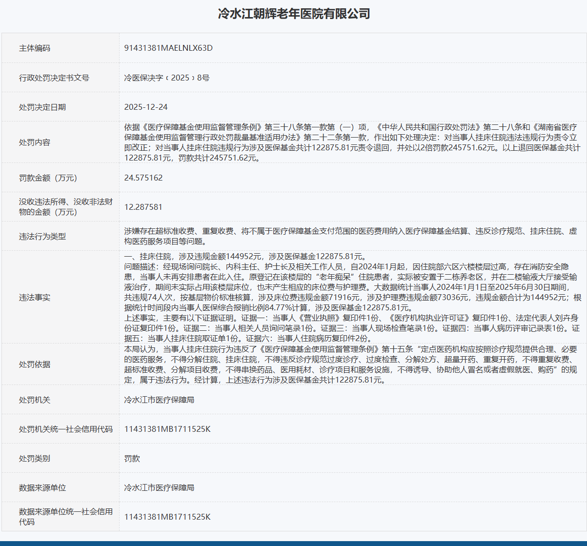 医保基金是参保群众的“救命钱”,任何欺诈骗保行为都将受到严厉惩处。从湖南省发改委信用平台公示的行政处罚信息获悉,2025年12月24日,冷水江市医疗保障局对冷水江朝辉老年医院有限公司作出行政处罚(冷医保决字﹝2025﹞8号),该医院因挂床住院等多项医保违规行为,被责令退回医保基金122875.81元,并处245751.62元罚款,罚没金额合计368627.43元。