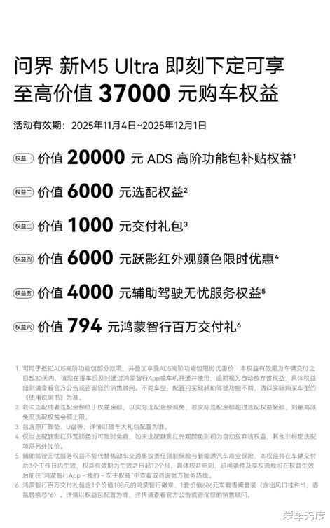 广州车展的热烈反响,印证了问界新M5 Ultra在产品力与用户信任之间的良性循环。其不仅在颜值与性能上满足多元需求,更将安全理念贯穿于辅助驾驶、车身结构、座舱环境等每一个环节。叠加总价值37794元的限时购车权益——包括20000元ADS高阶功能包、6000元选配金、4000元辅助驾驶无忧服务、1000元交付礼包、794元鸿蒙智行百万交付礼,以及跃影红车色专属6000元优惠。