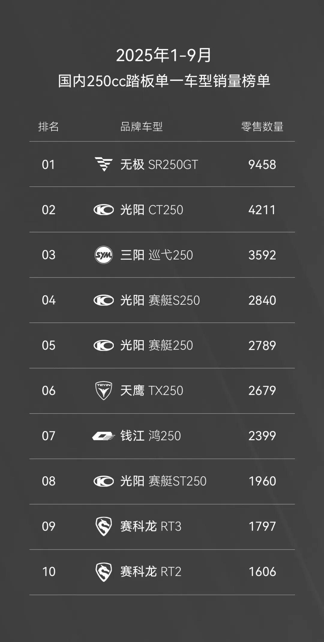 无极SR250GT的成功或许刚好是满足了以上的几点重要因素,加上一线大厂的品牌效应自然也让这台车出圈。所以某种程度上SR250GT的热销也并非偶然,起码在综合表现上确实有着可圈可点的实力。而且从最新一份销售数据中显示今年1-9月份250cc踏板单一车型销量数据上可以看到,SR250GT以9,458台的出色表现超越了第二名光阳CT250整整2倍有余,这可能是无极自己都没曾想到的市场表现。