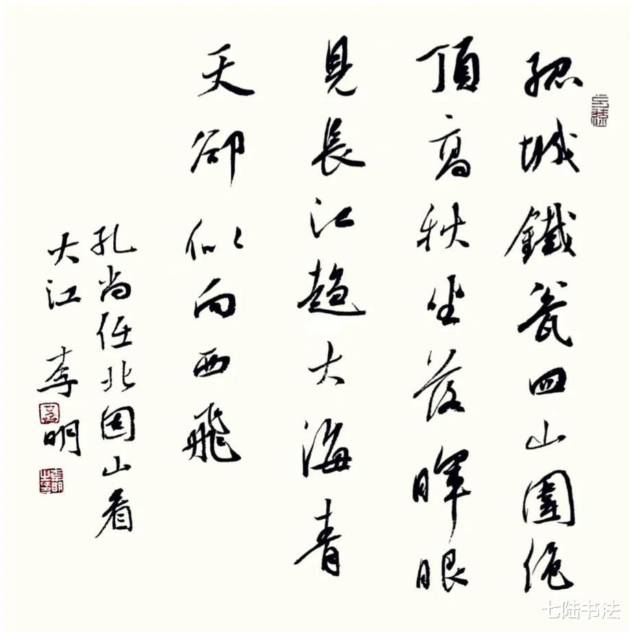 行草创作则彰显了李明先生书法“笔势洞达,如锥画沙”的金石质感与抒情张力。他清醒地意识到小字追求大字气势的局限性,因此着力通过行草线条展现“更饱满的体量和更厚密的气质”。