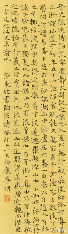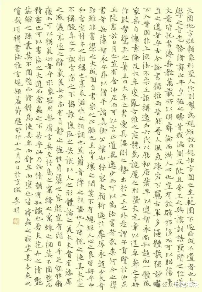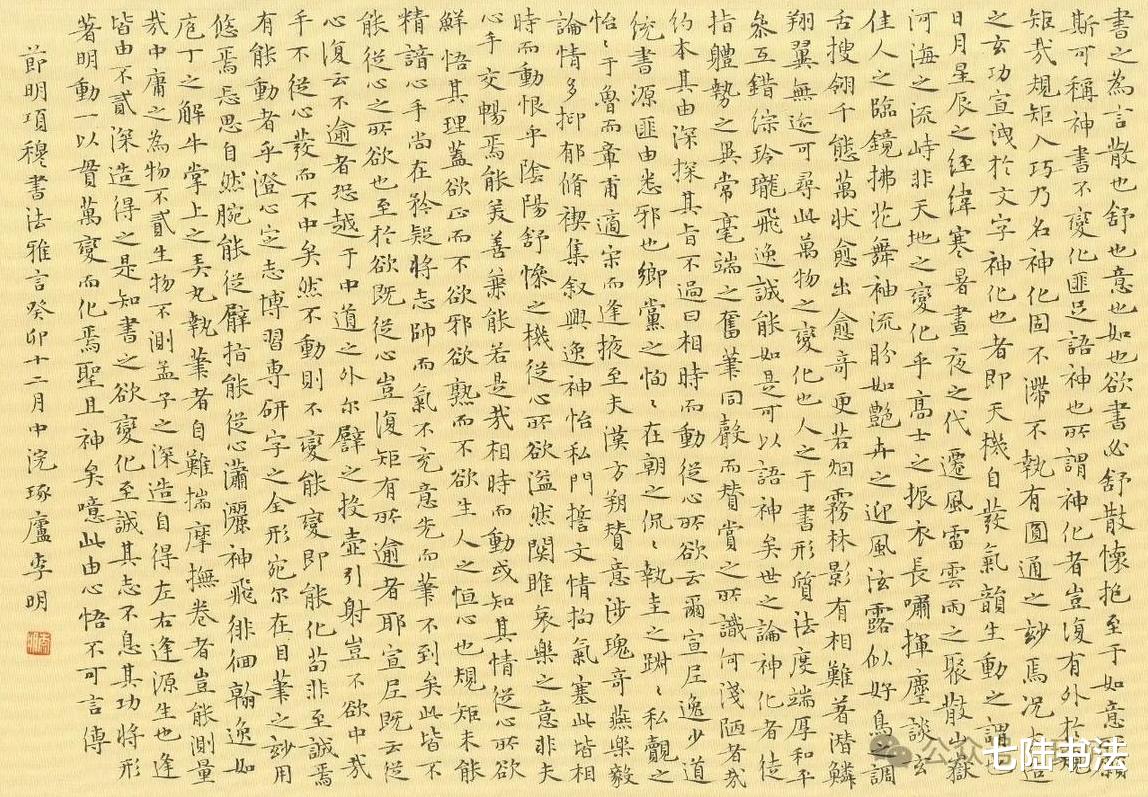 在李明先生的书法创作中,小楷堪称其标志性成就,尽显“气韵高古,章法天成”的魏晋风度。他的小楷创作始终追求“技近乎道”的境界,精研用笔的粗与细、藏与露、方与圆,巧思结体的疏密、宽窄、正欹,在矛盾关系的平衡中赋予小楷鲜活神采。