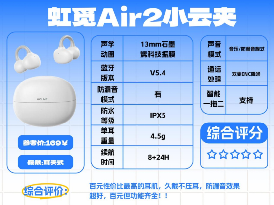 热门高性价比耳夹式耳机推荐虹觅HOLME Air2小云夹价格:169元