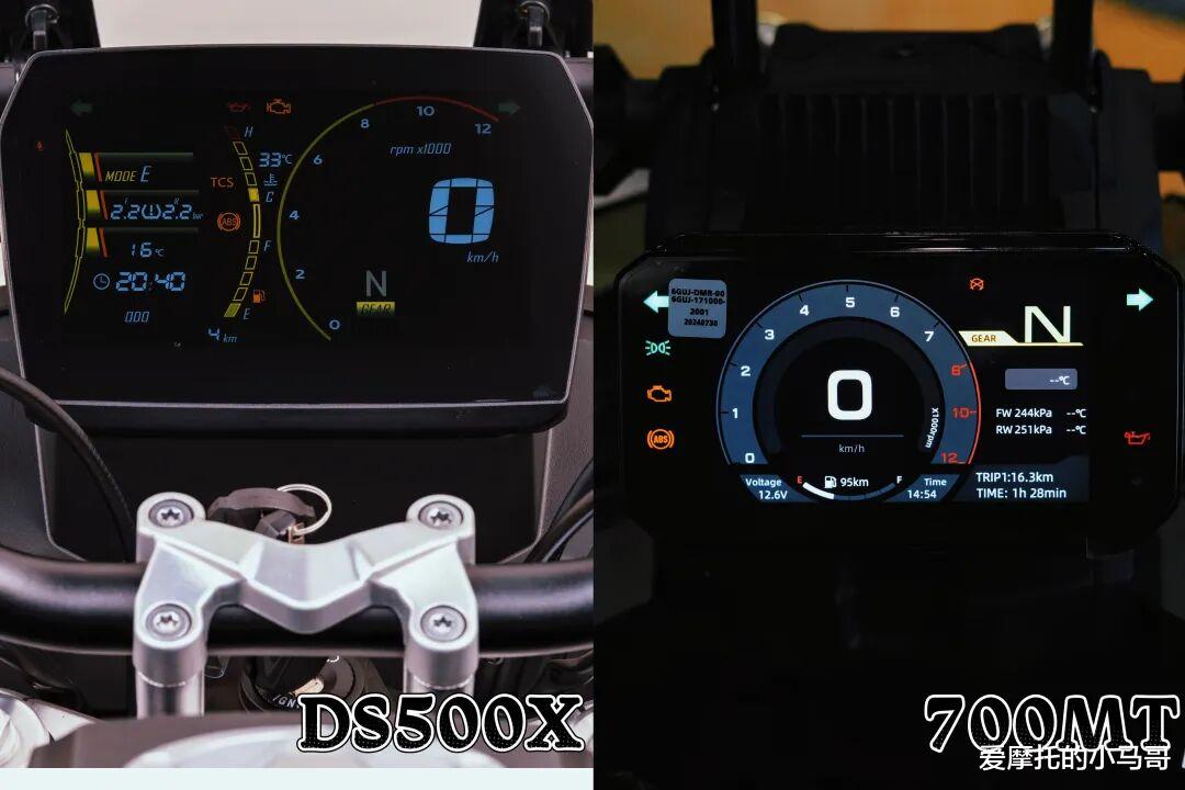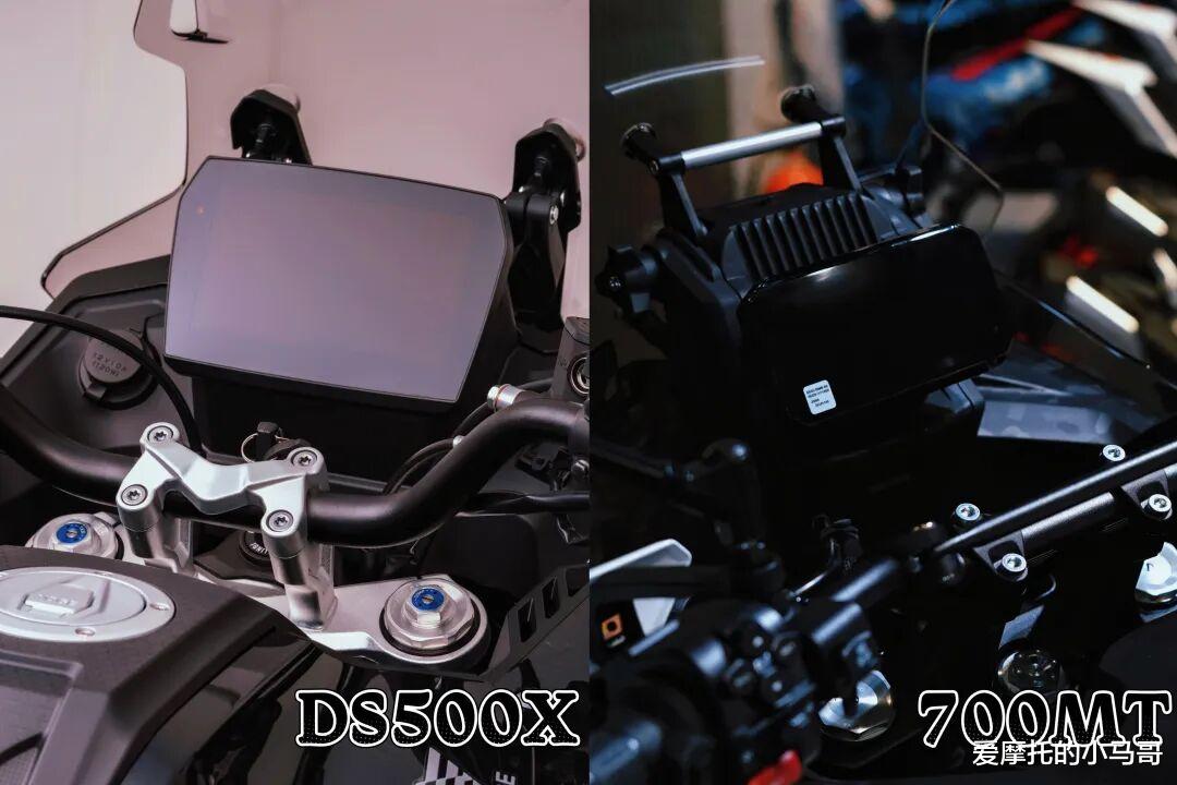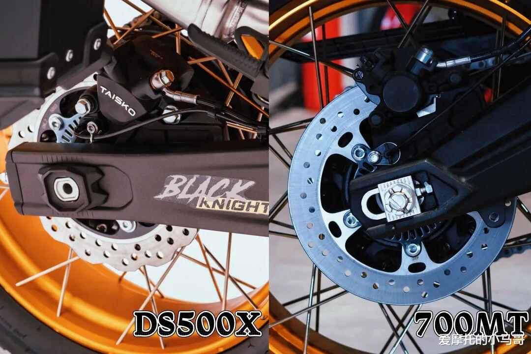 减震方面:春风700MT搭载自制全段可调减震,偏向舒适性的调教,滤震效果和支撑性没啥大毛病;无极DS500X选用渝安一线大厂减震,前后全可调,阻尼细腻、支撑均衡,砂石路过滤到位,弯道与小飞坡也不会触底,支撑性与舒适性兼顾得恰到好处。