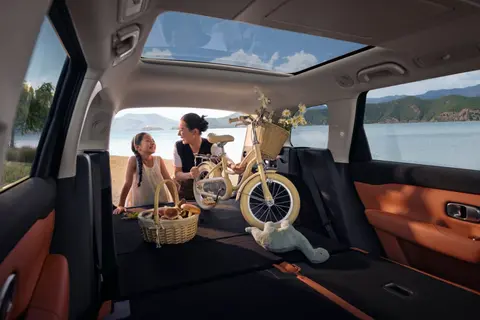 入门版座椅是仿皮座椅,触感柔软,高配车型更是升级为 Nappa 真皮,质感翻倍;前排加热、通风是全系标配,长途坐再久也舒服,高配车型的主驾、二排还额外加了 10 点位气动按摩,8 种模式、3 种力度可调,背部、肩部、腰部都能照顾到,缓解旅途疲劳真是功不可没。说到它的三温区自动恒温空调真要给它竖大拇指,特别实用!前排是隐藏式电动出风口,避免直吹,二排、三排都有独立吹面和脚部出风口,关键是后排乘客不需要通过驾驶员,自己能调节温度。车内储物空间也处处是惊喜,其前排中央扶手箱能放纸巾、充电器,门板能塞 4 瓶 550ml 矿泉水,二排有杯架,中央通道下方还能放背包、折叠伞,杂物摆放得明明白白。而且五座顶配和六座顶配车型都配备了 8.1L 车载冰箱,夏日出行随时能喝到冰爽饮品。