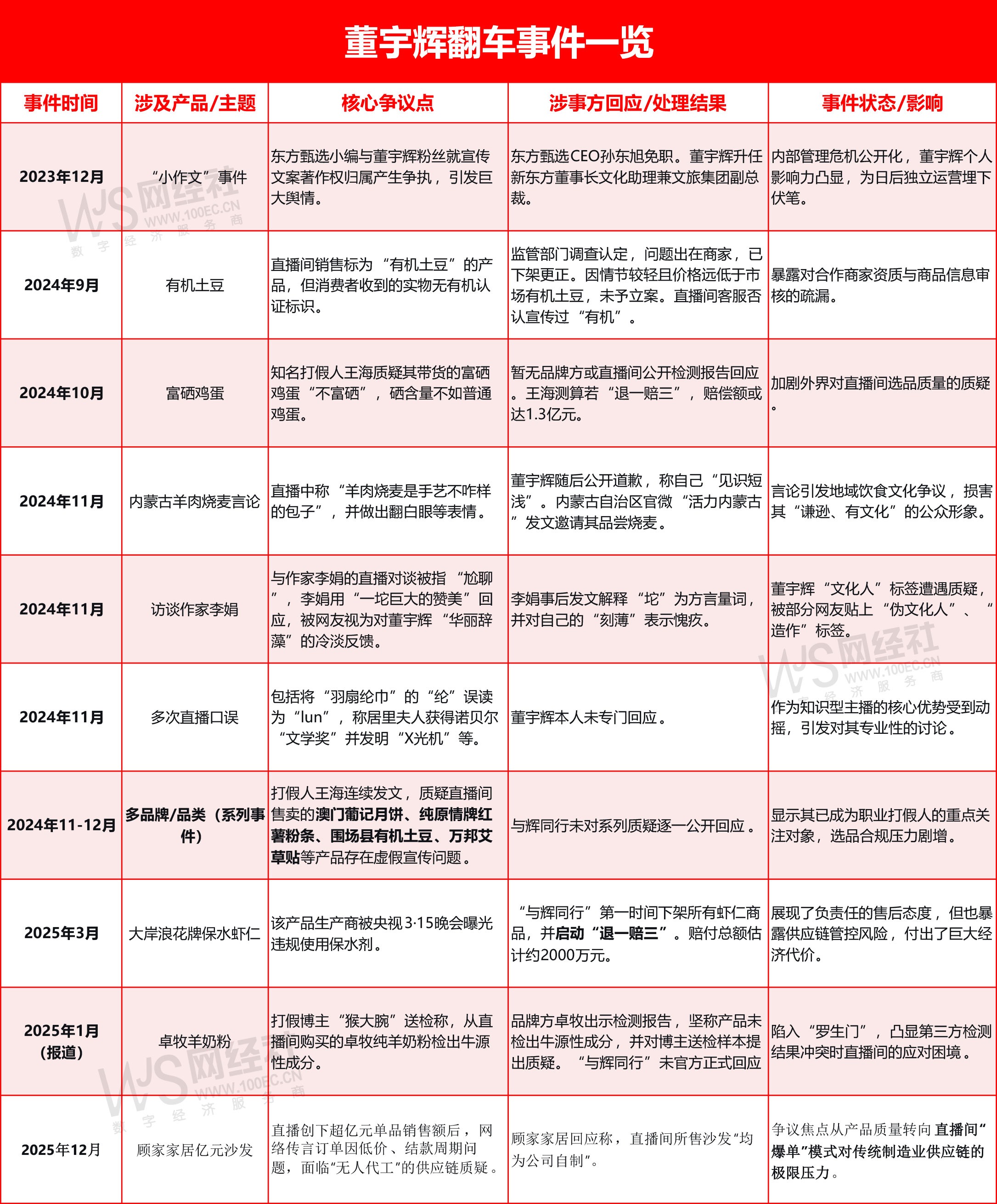 2024年10月,董宇辉在直播间销售“富硒鸡蛋”,知名打假人王海质疑其带货的富硒鸡蛋“不富硒”,硒含量不如普通鸡蛋。然而,暂无品牌方或直播间公开检测报告回应。王海测算若“退一赔三”,赔偿额或达1.3亿元。