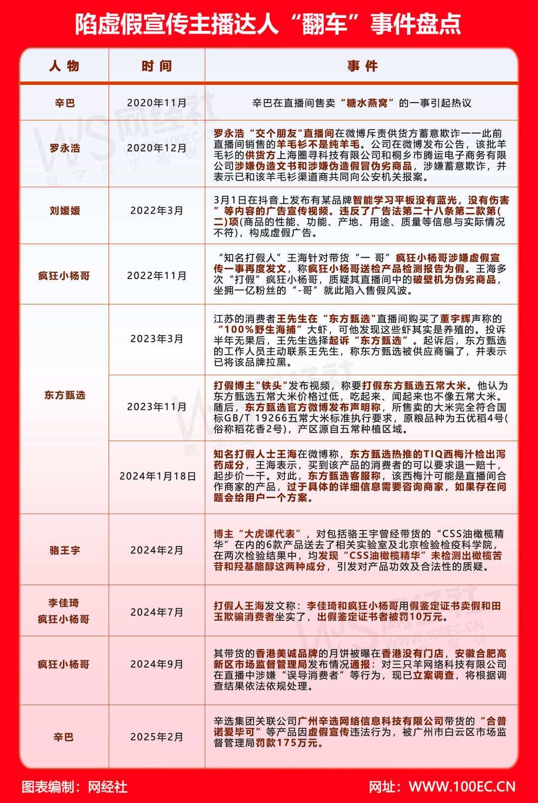 据网经社不完全统计,辛巴、罗永浩、刘媛媛、疯狂小杨哥、东方甄选、骆王宇、李佳琦、东北雨姐等MCN机构及主播均陷入虚假宣传风波。如抖音“美妆一哥”骆王宇因“油橄榄”事件被“打假”后宣布退网,表示将为消费者退款1.5亿元;东方甄选售卖的西梅汁遭禁;“三只羊”带货“香港美诚月饼”“澳洲谷饲牛肉卷”虚假宣传被罚6894.91万元。