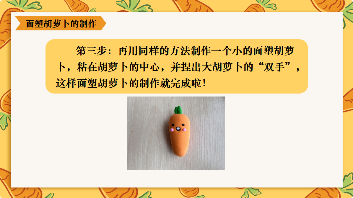 创作过程中,孩子的想象力与创造力也得到充分激发:他们可以发挥创意,为“胡萝卜”增添不同细节,比如用棕色橡皮泥点缀“泥土痕迹”,或用白色橡皮泥制作“小露珠”,让作品更具生动性。同时,在追求作品逼真度的过程中,孩子能深刻体会匠心独运的价值,学会沉下心来打磨细节、精益求精。