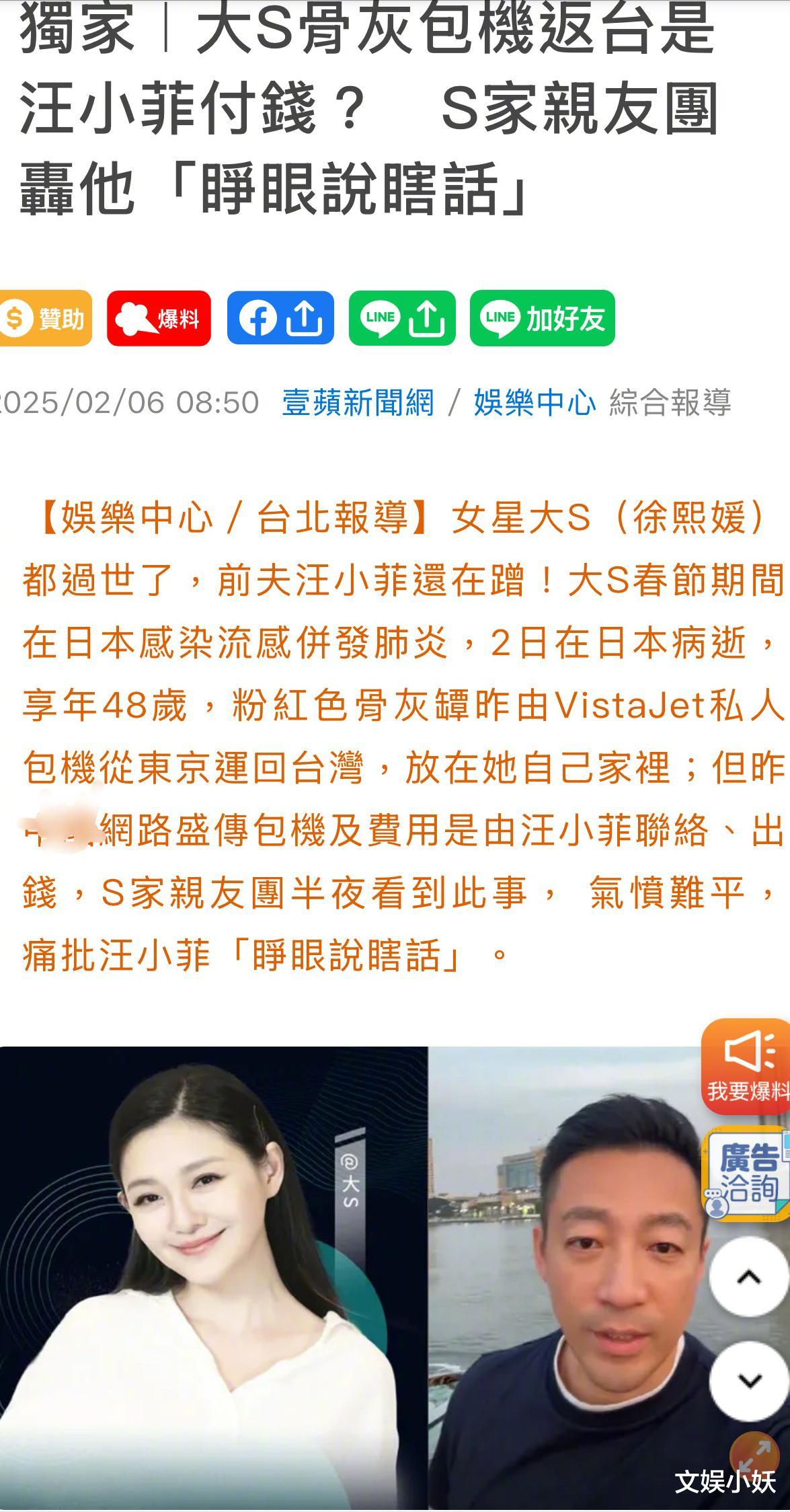 据台媒报道,汪小菲近日卷入一场争议风波。有传言称他“包机赴台处理大S后事”,疑似暗指徐家人不作为。对此,据台媒6日报道,小S通过经纪人回应汪小菲“包机”传闻,称姐姐后事都是由徐家人在负责:“现在为什么会出现是汪小菲包机的这个谎,我实在无法理解!人在做天在看,尤其我姐姐现在也在天上了,这种让人无法容忍的谎言还要继续出现吗?