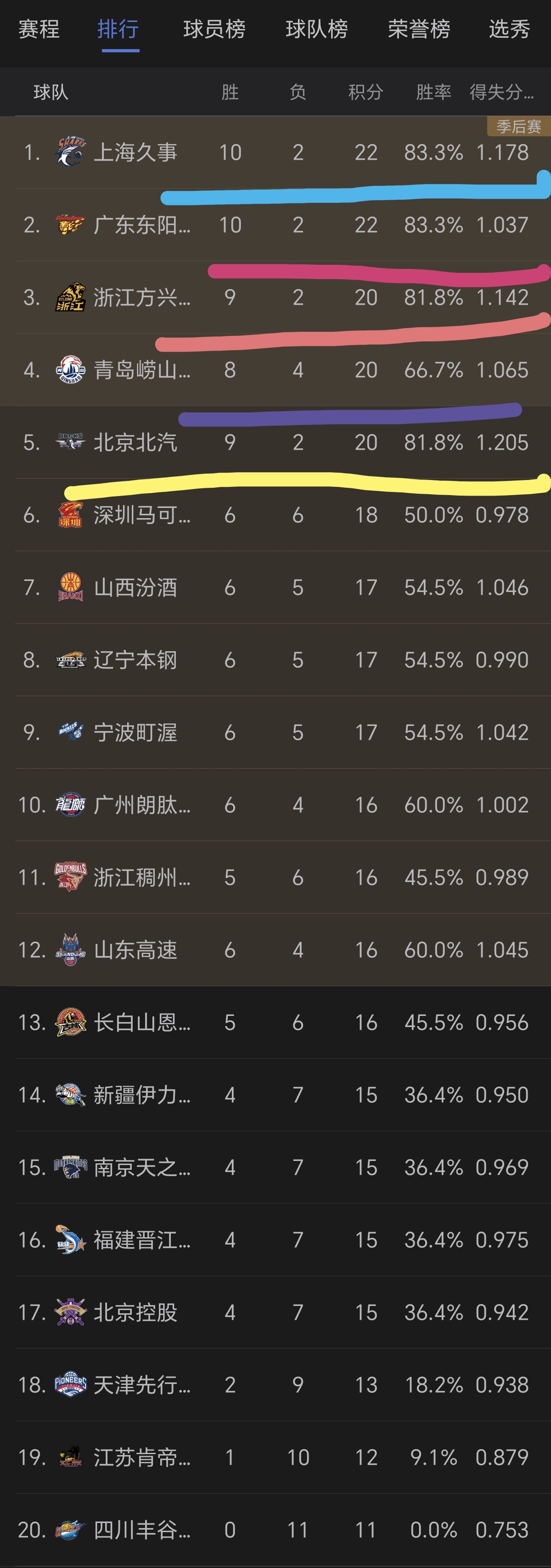 吉林第13、新疆第14、同曦第15、福建第16、北控第17、天津第18、江苏第19、四川第20。