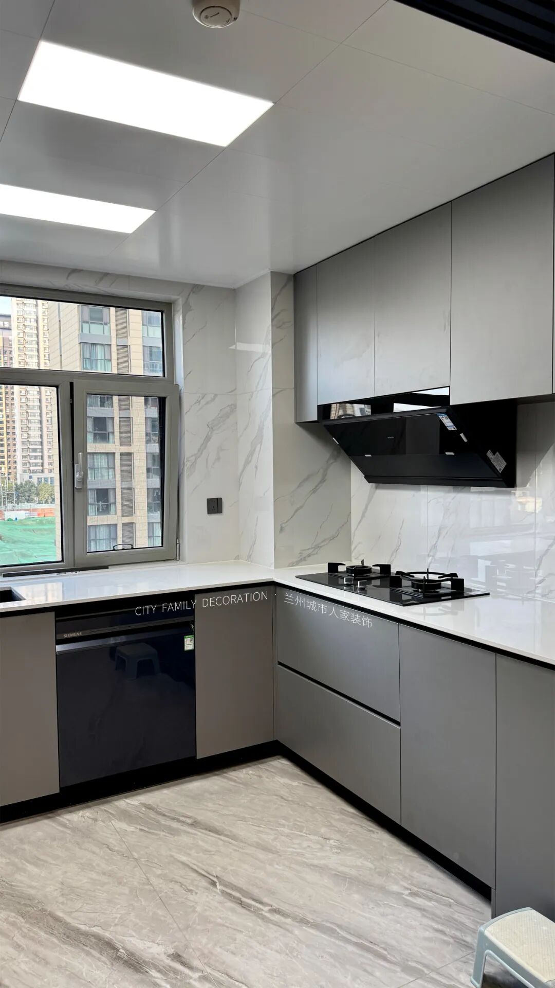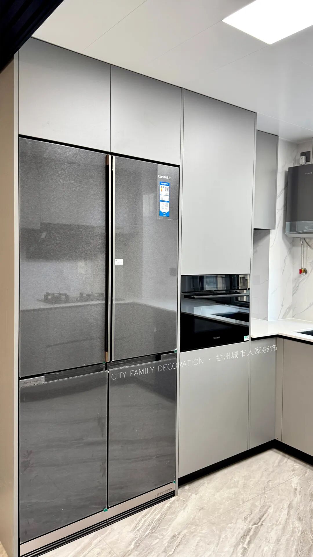 全嵌式冰箱、洗碗机藏进灰调橱柜里