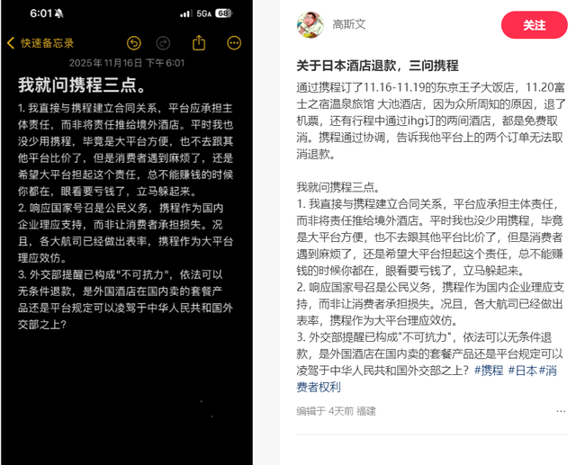 首先他表示直接与携程建立合同关系,平台应承担主体责任,而非将责任推给境外酒店。平时我也没少用携程,毕竟是大平台方便,也不去跟其他平台比价了,但是消费者遇到麻烦了,还是希望大平台担起这个责任,总不能赚钱的时候你都在,眼看要亏钱了,立马躲起来。