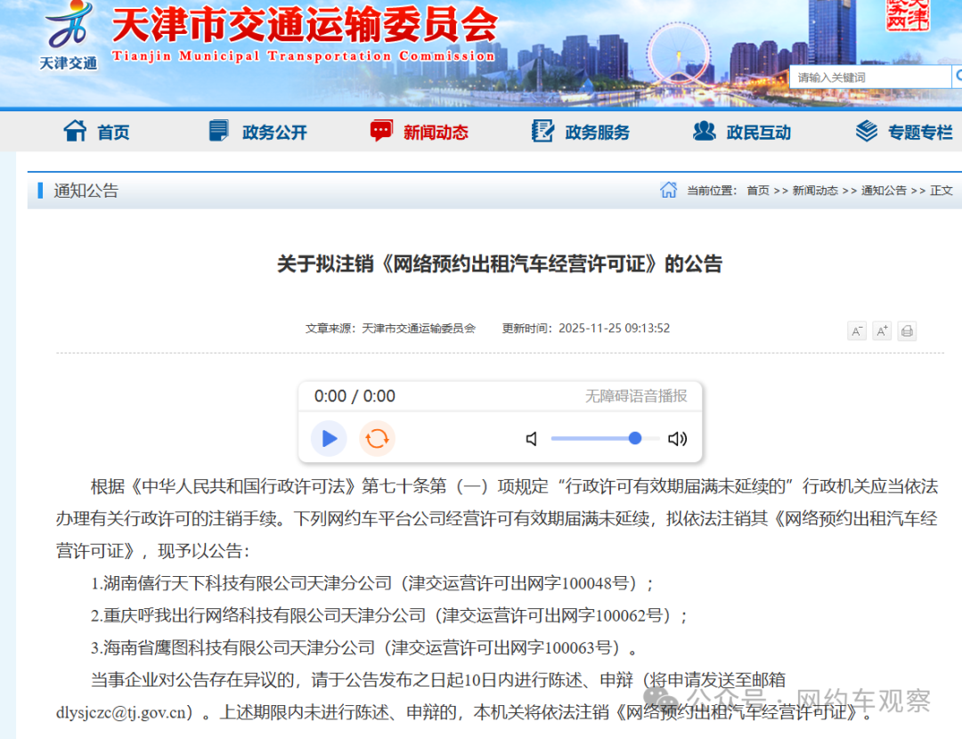 今年11月,天津市交通运输委员会先后发布两则公告。11月25日,湖南僖行天下科技有限公司天津分公司、重庆呼我出行网络科技有限公司天津分公司等三家平台因经营许可有效期届满未延续,被依法拟注销许可证。