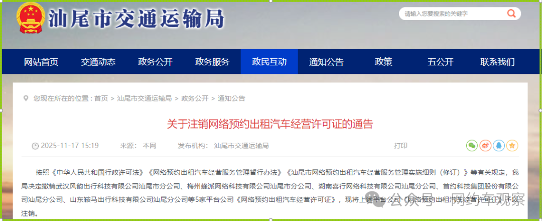 11月17日,汕尾市交通运输局发布通告,撤销武汉风韵出行科技有限公司汕尾市分公司等5家平台的经营许可。监管不再看平台体量,而是聚焦是否真正具备合规运营能力。
