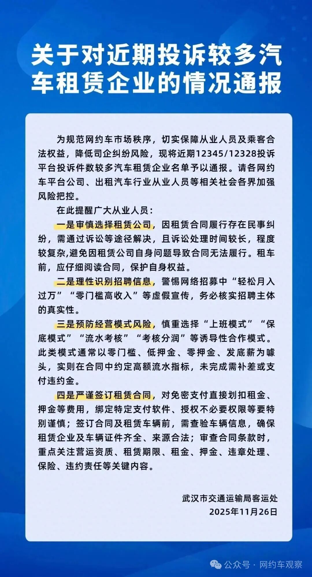 此外,11月26日,武汉市交通运输局客运处发布了《关于对近期投诉较多汽车租赁企业的情况通报》,披露了近期投诉较多企业名单,以便各网约车平台公司、网约车车辆管理人、网约车驾驶员做好风险把控,审慎选择合作主体。名单涉及6家网约车运力公司,列入风险警示名单原因主要是“押金问题、退车问题、合同纠纷、涉嫌安排无证车辆、车辆维修问题等。