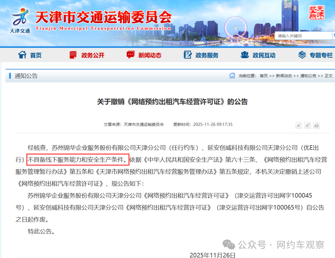 仅隔一天,苏州锦华企业服务股份有限公司天津分公司(任行约车)和延安创威科技有限公司天津分公司(优E出行)因不具备线下服务能力和安全生产条件,被直接撤销许可证。