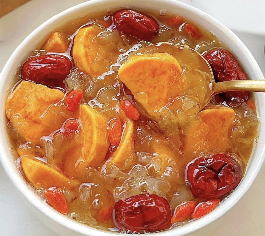 当银耳变得浓稠,出现胶质后,就可以把红薯块和红枣放进锅里啦。继续用小火炖煮15分钟到20分钟,直到红薯变得软糯,用筷子轻轻一戳就能戳进去。这时候,加入红糖,搅拌一下,让红糖慢慢融化。再加入枸杞,煮个2 - 3分钟就可以了。枸杞不用煮太久,不然会煮烂,影响口感和美观。家人们,赶紧动手试试这道银耳红薯羹吧!让这份甜蜜和温暖,在这个秋冬,温暖你的胃,更温暖你的心。