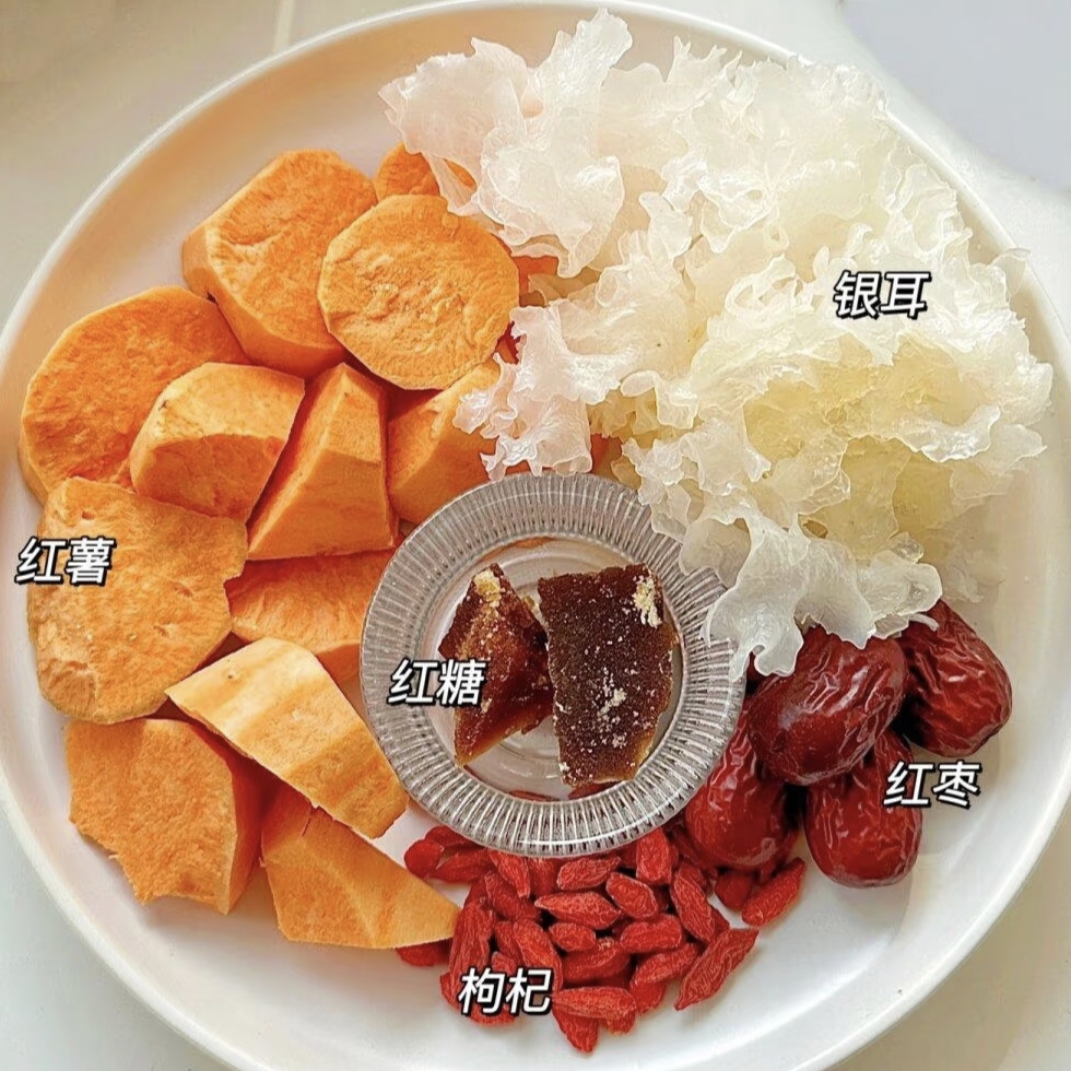 制作这道银耳红薯羹,食材简单又常见。主角就是银耳和红薯这对黄金搭档。银耳,那可是美容养颜的“平民燕窝”,富含天然植物性胶质,能让咱们的皮肤变得水嫩有光泽。红薯呢,香甜软糯,富含膳食纤维,既能促进肠道蠕动,又能给人满满的饱腹感。除了这两位主角,再准备点红糖和枸杞、红枣。红糖能让羹汤更加清甜,枸杞则能增添一抹亮丽的色彩,还带着微微的酸甜,还有红枣营养也超丰富。