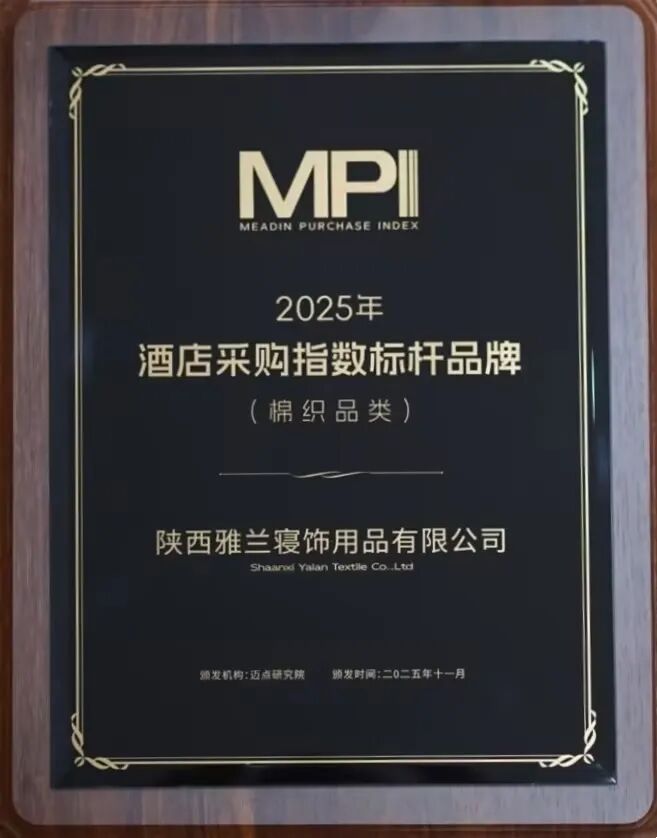 近日,在由迈点主办的2025迈点MPI酒店采购盛典上,陕西雅兰寝饰用品有限公司凭借在酒店布草领域的技术深耕与品质坚守,荣获2025年酒店采购指数标杆品牌(棉织品类)奖项。