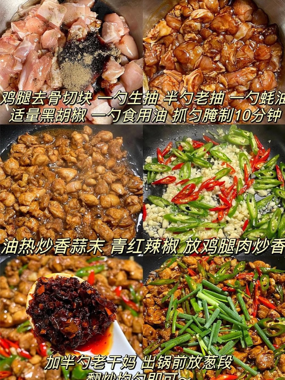 炒锅里的油刚冒热气,蒜末就迫不及待地释放香气。这时候青红辣椒段该登场了,我喜欢用二荆条和小米辣搭配,一个清香一个爆辣,切成滚刀块或者长条都随你,反正最后都会被抢着吃掉。辣椒炒到边缘微微发焦时盛出来,别担心会夹生,等下还要和鸡腿肉"二次会师"。接着把腌好的鸡腿肉倒进锅里,中火慢慢煸炒,你会看到肉块逐渐变成诱人的焦糖色,油脂滋滋作响,这时候把刚才的辣椒倒回来,加半勺老干妈——记住是油辣椒不是豆豉款,翻炒两下立刻满屋飘香。