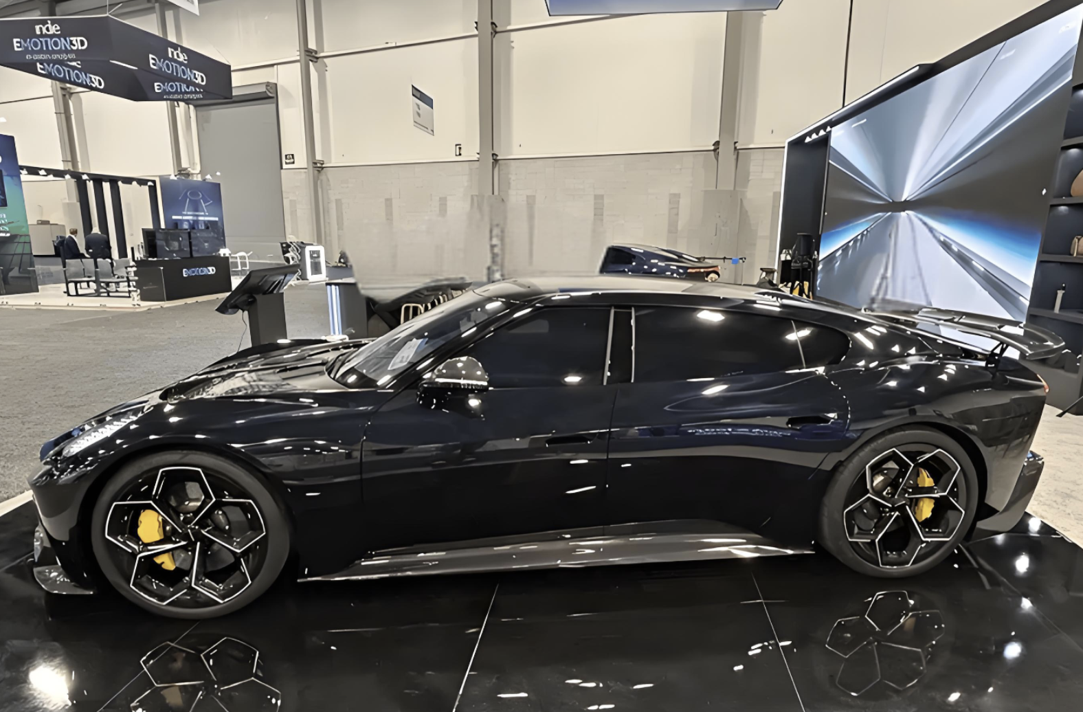来到车身侧面,KOSMERA高性能跑车采用轿跑式的车身轮廓,弧线形的车顶在尾部进行下压式的溜背式造型。车窗四周加入了黑色的车窗装饰条,若隐若现的车身腰线十分灵动。黑色碳纤维宽体装饰面板搭配着双五辐式轮圈以及内置黄色刹车卡钳。两侧还配备隐藏式车门把手、四个宽大的无边框车门,提升了整车的运动气息。两侧配备了水滴形的倒车镜配备了亮黑色外壳,更像是画龙点睛之笔。同时,该车为了降低空气阻力,将前包围处设置了引流槽,使得迎面气流能够更好的导向侧面,降低阻力的同时也可以增强散热器上的空气流动。