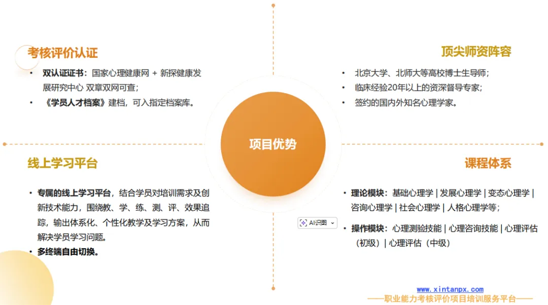 实操操作模块:心理测验技能、心理评估(初级)|心理评估(中级)、心理咨询技能、职业伦理