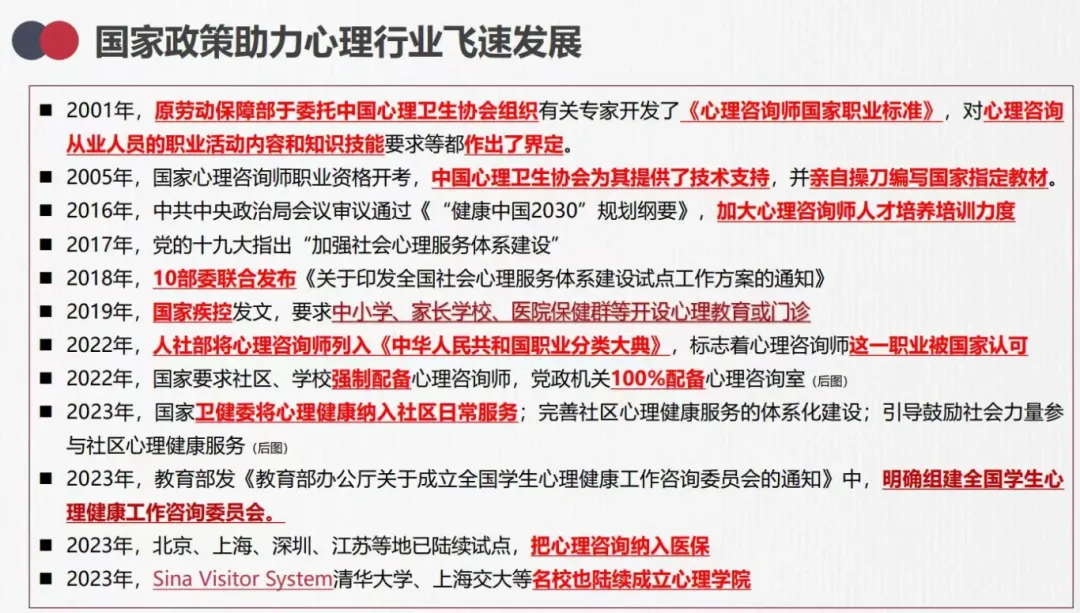 近年来,国家高度重视心理健康工作,陆续出台多项政策,推动心理健康服务体系的建设与规范。这些举措不仅提升了行业专业化水平,也进一步巩固了心理咨询师的社会认可度与职业地位。