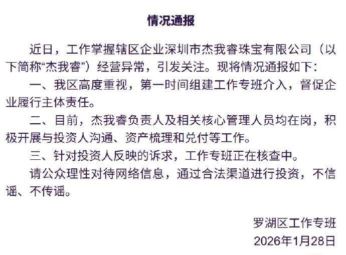 针对杰我睿珠宝经营异常,1月28日,罗湖区在官方微博“罗湖发布”中发布公告称,罗湖区高度重视,第一时间组建工作专班介入,督促企业履行主体责任。目前,杰我睿珠宝负责人及相关核心管理人员均在岗,积极开展与投资人沟通、资产梳理和兑付等工作。针对投资人反映的诉求,工作专班正在核查中。