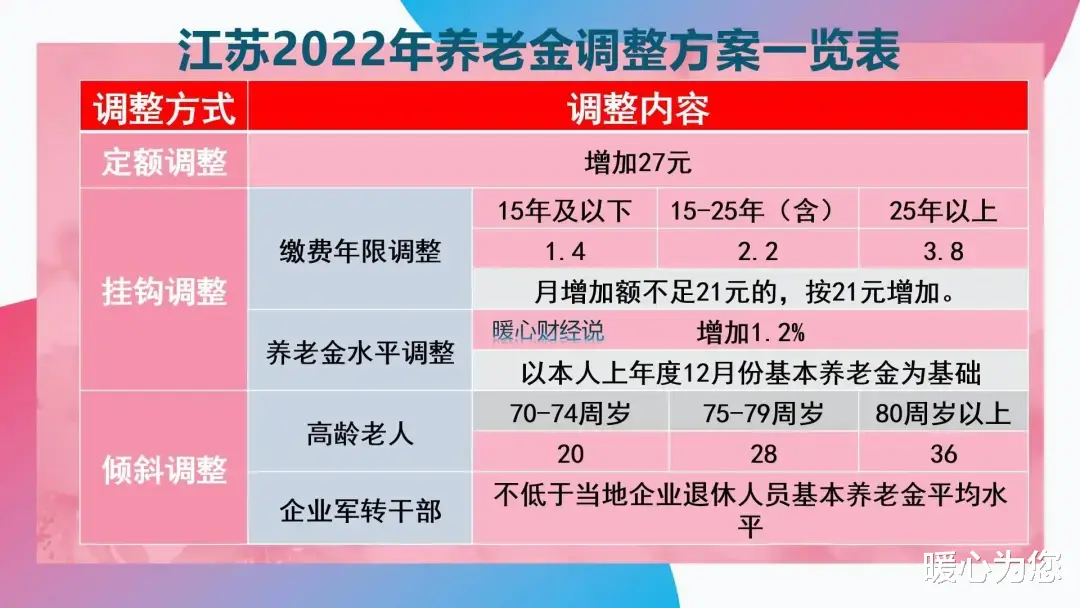 关于养老金的调整,江苏省历年都会按照国家规定的定额调整、挂钩调整与适当倾斜相结合的办法来进行。江苏省2022~2024年的养老金调整方案是这样的: