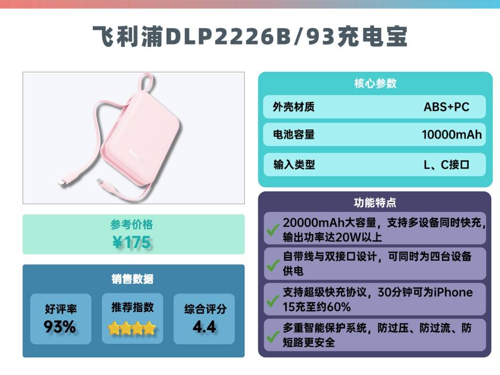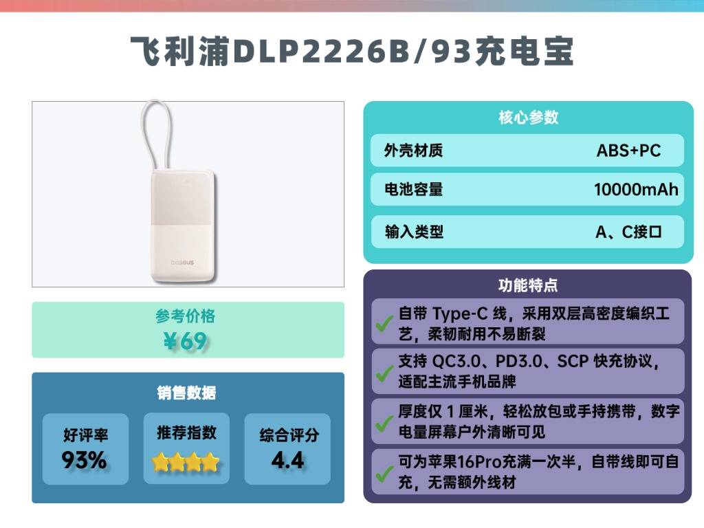 飞利浦这款充电宝以“小而实用”著称,10000mAh的电池容量、约6000mAh的额定输出,配合仅180g的重量和类似银行卡大小的尺寸,极具便携性。它自带两条数据线,支持Type-C与Lightning接口,日常外出无需额外携带充电线。