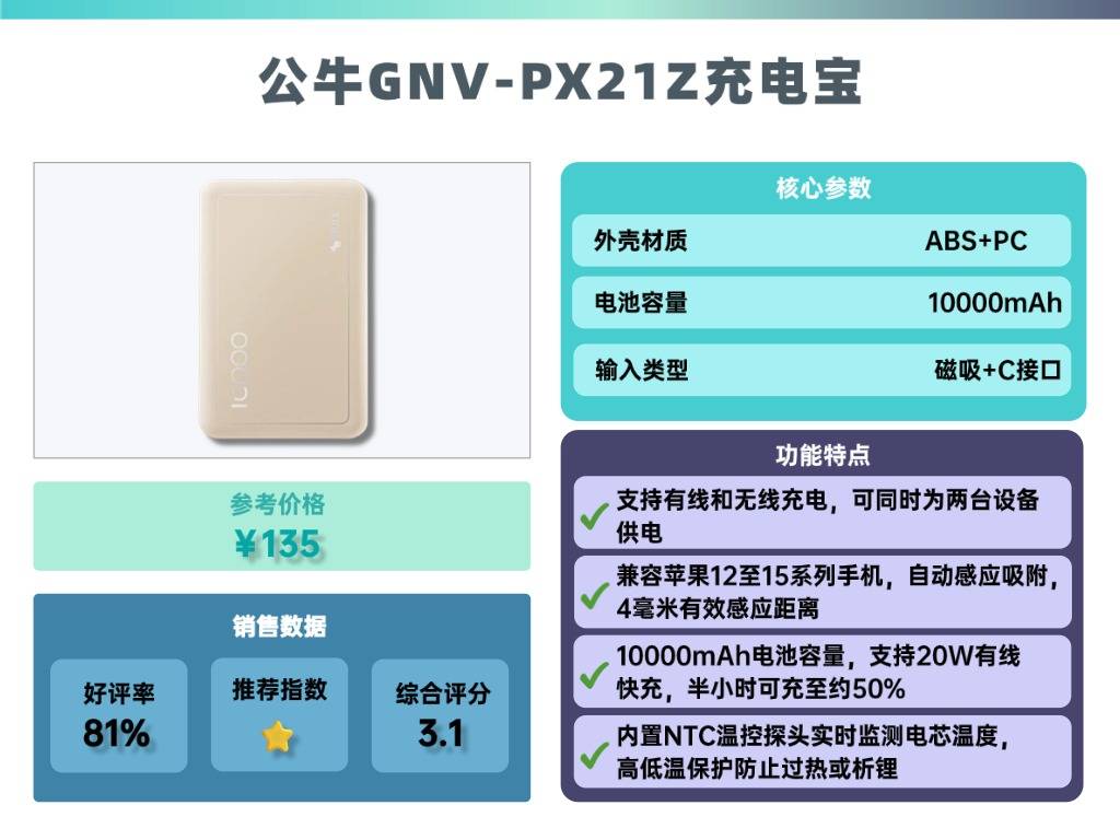 公牛这款GNV-PX21Z在兼顾磁吸与有线充电方面表现均衡。它支持15W磁吸无线快充,苹果12到15系列都能直接贴合使用,吸附力强,不取壳也能正常充电。10000mAh的容量能支撑一整天多设备续航,20W有线快充实测半小时左右可充至50%。70mm的机身宽度握持舒适,不遮挡摄像头或影响操作,设计上偏向实用和商务风。