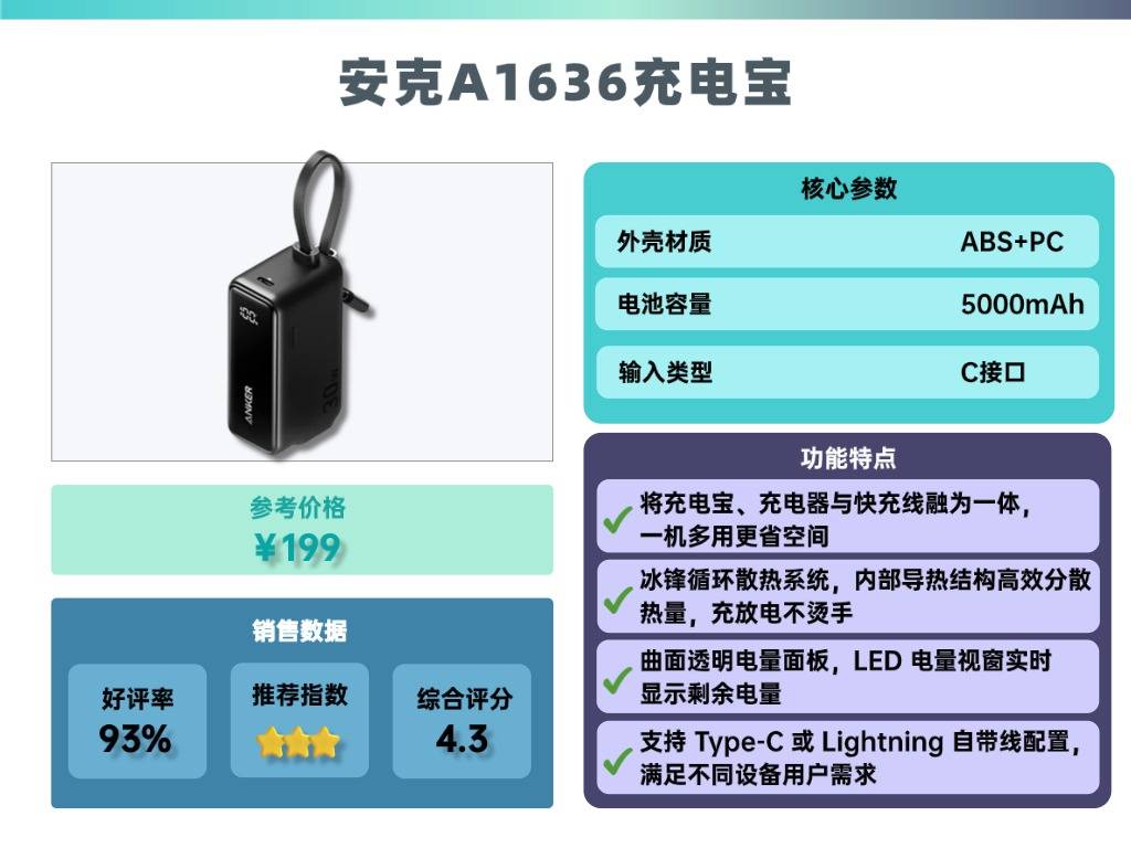 安克A1636是一款集充电宝、充电头和快充线于一体的便携产品,主打“随手即可充”的便利性。5000mAh的容量在日常应急场景下够用,但对于重度用户来说略显不足。