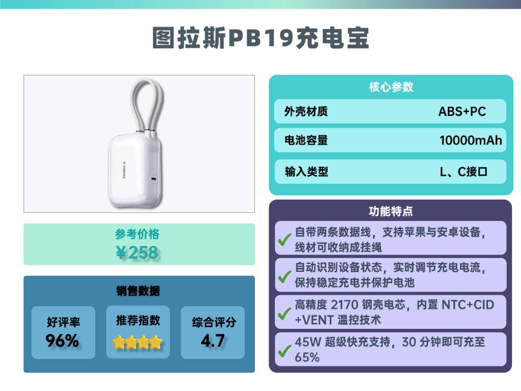 图拉斯PB19是一款设计感与性能并重的充电宝。容量为10000mAh,额定输出约6500mAh,支持45W快充,在实际测试中给手机充半小时可达六成电量左右。它配备两条自带线,其中一条支持苹果与安卓设备通用,另一条可作提绳,线材为尼龙编织结构,抗弯折表现不错。